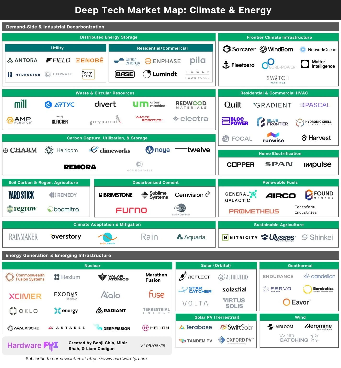 Benjamin Chia of Hardware FYI mapped the climate & energy landscape in 2025 - startups, infrastructure, & everything in-between. As he notes, “Despite the funding slowdown, it's still a massive, unresolved problem!”