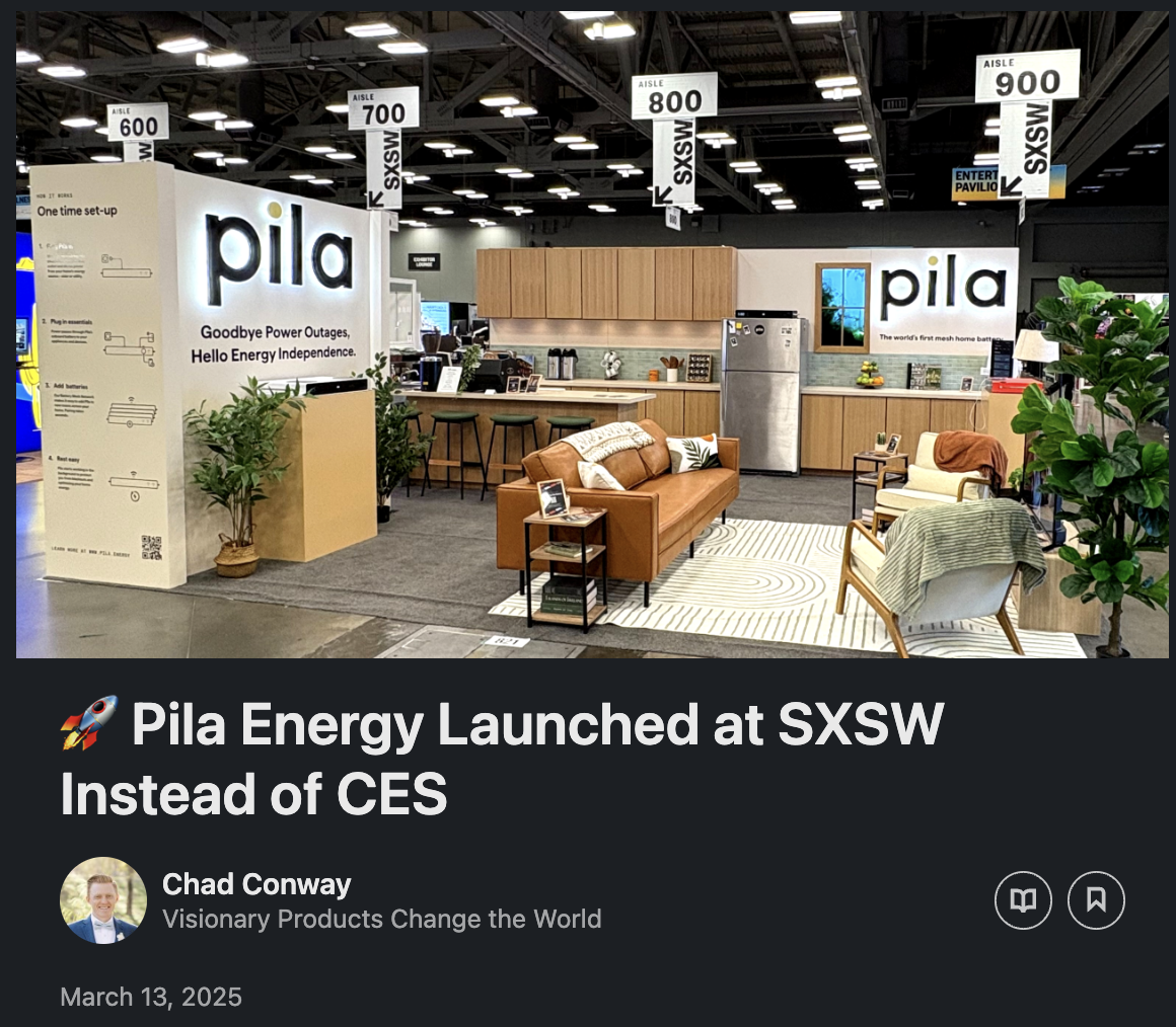 We knew that simply launching a website wouldn’t be enough to cut through the noise. Instead, we focused on making Pila real. Seeing is believing—and after hundreds of conversations, Pila was repeatedly called the best booth at SXSW. For us, it was an invaluable opportunity to engage with customers from across the U.S. and abroad. One thing that’s clear: Nearly all of us are grappling with worsening outages affecting our homes, businesses, and loved ones. Better solutions are a must!
